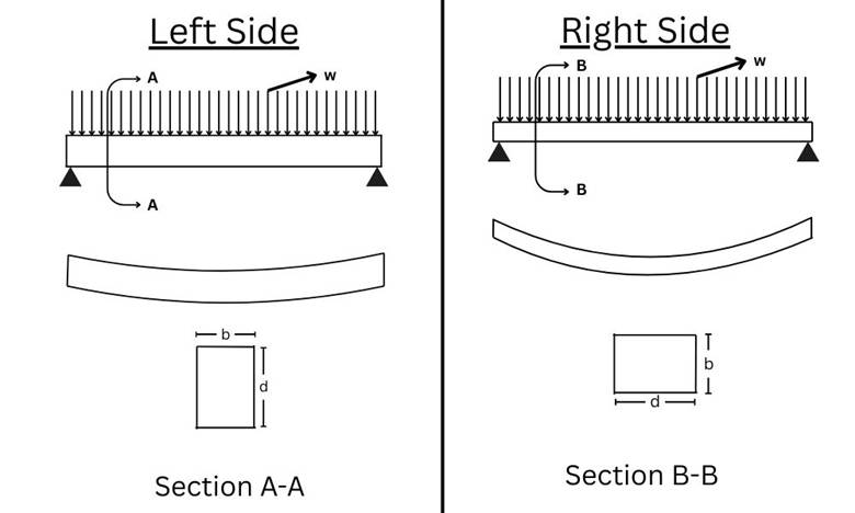 On the left and right sides, you can see the position of the beam. On the left side, the longer dimension is placed in the vertical direction, and on the right, in section B-B, the smaller dimension is placed vertically. You can also observe the deflections; the deflection on the right side is greater, and on the left side, it is smaller, which is practically true. This is due to the moment of inertia; both beams are the same, but their placement differs, which changes the area moment of inertia. In Figure 1, the moment of inertia is greater on the left side than on the right side, which causes a smaller deflection on the left side compared to the right side. You might be wondering how the left side moment of inertia is greater than the right side, and how deflection depends on the area moment of inertia. Let’s discuss this.